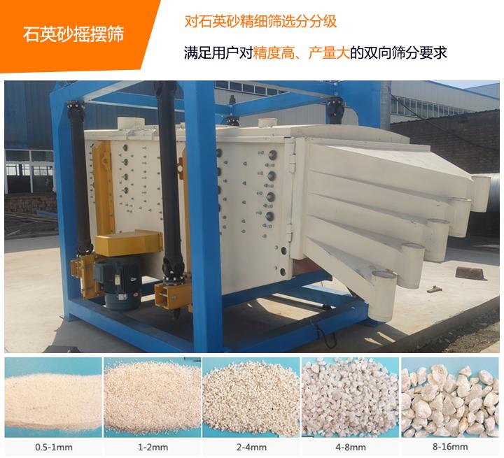 石英砂搖擺式主要是對石英砂精細篩選分級,石英砂搖擺篩篩網常用規(guī)格有:0.5-1mm、1-2mm、2-4mm、4-8mm、8-16mm、16-32mm、10-20目、20-40目、40-80目、100-250目。石英砂搖擺篩是解決因旋振篩精度高但產量小、直線篩產量大但精度低這類篩分問題而設計的,該款設備設計預案中具備了篩分精度高、產量大的特性,可以滿足用戶對精度、產量雙向要求的篩分要求。